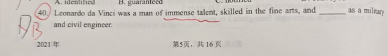 老师解答:句子前半部分提到达・芬奇是 “a man of immense talent”(极具天赋的人),并在美术方面技艺精湛,后半句是对他作为军事和土木工程师能力的补充描述。exceptional 意为“杰出的、非凡的、例外的”,与“immense talent”呼应,准确表达了他在工程领域同样卓越非凡。